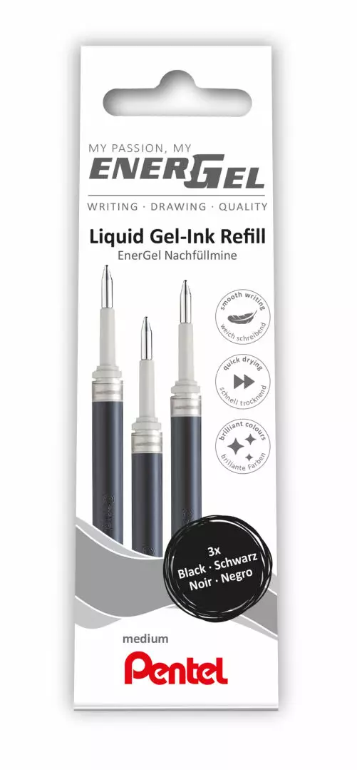 Pentel Energel-geelikynäperheen ohutkärkinen malli. Runko valmistettu 54% kierrätysmateriaalista