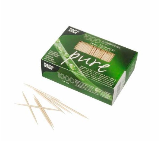 Puinen hammastikkku 1000 kpl -pakkauksessa.