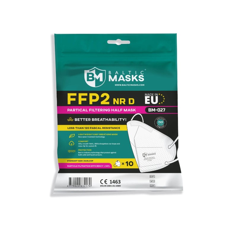 BM-027 FFP2-hengityssuojain on suunniteltu istumaan tiiviisti kasvoille. Suojaimessa on muotoiltava nenäpidike ja korvien taakse kiinnitettävät joustavat lenkit. Suojaimen nelikerroksinen rakenne takaa alhaisen hengitysvastuksen ja käyttömukavuuden. Luokan FFP2-hengityssuojain muodostaa vähintään 94% suojan yli 0,3 mikronin mittaisia hiukkasia vastaan ja tarjoaa kirurgisia suu-nenäsuojuksia tehokkaampaa suojaa.