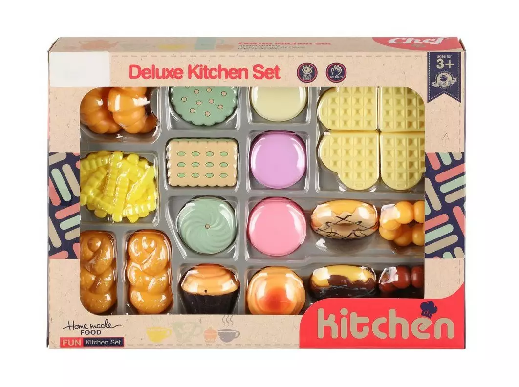 Lasten leikkiruokasetti sisältää makeita ja suolaisia herkkuja, mm. paloitellun vohvelin, donitseja, ranskanperunat ja croisantteja. Tämä setti vie kahvilaleikit aivan uudelle tasolle!