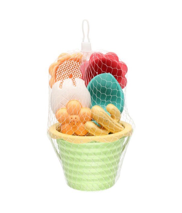 Kauniin väriset hiekkalelut hiekkalaatikolle tai uimarannalle. Setissä ämpäri, hiekkasihti, kukanmuotoisia hiekkatyökaluja ja kaktuksen ja kukanmuotoinen muotti.