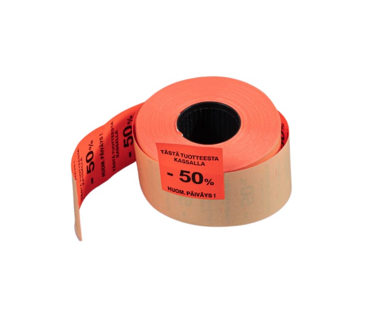 Punainen tarra pitävällä liimalla, teksti: "Tästä tuotteesta kassalla -50%. Huom. Päiväys!"