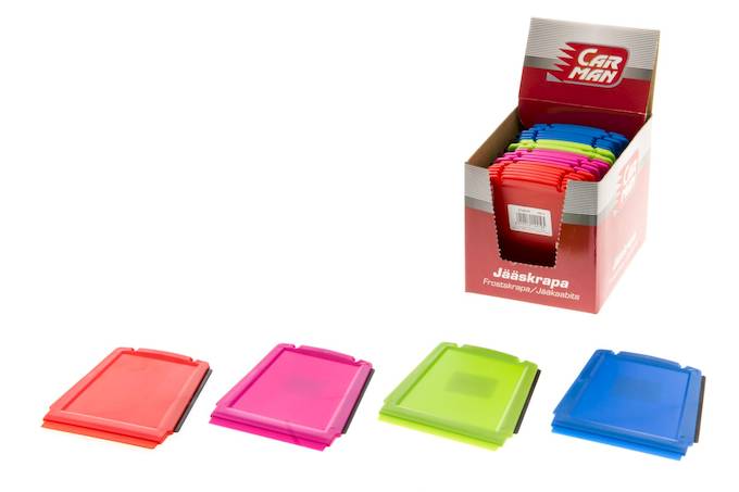 Iloisen värinen muovinen jääraappa. Tilaukselle valikoituu yksi raappa varastotilanteen mukaan. Voit myös esittää väritoiveen tilauksesi vapaamuotoisessa viestikentässä.