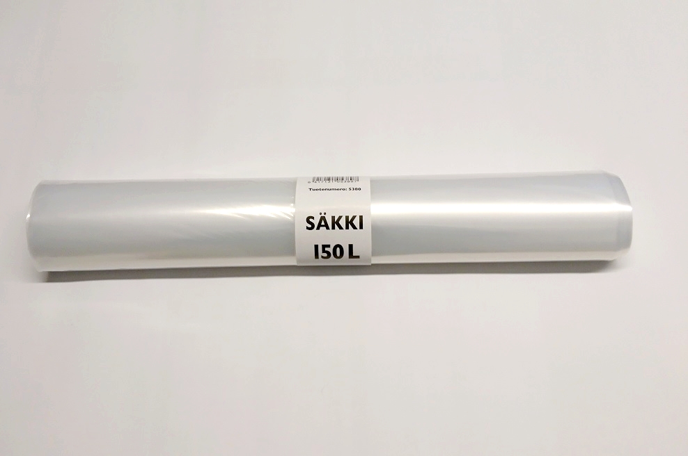 JÄTESÄKKI 150 L Materiaali: LD-PE. Koko: 750 x 1150 mm. Vahvuus: 0,05 mm. Väri: kirkas. 10 säk/rll, 20 rll/ltk, 40 ltk/lava.