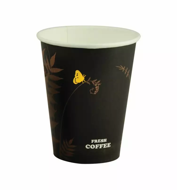 Kartonkinen kertakäyttökuppi, jossa ruskea painatus ja teksti Fresh Coffee.