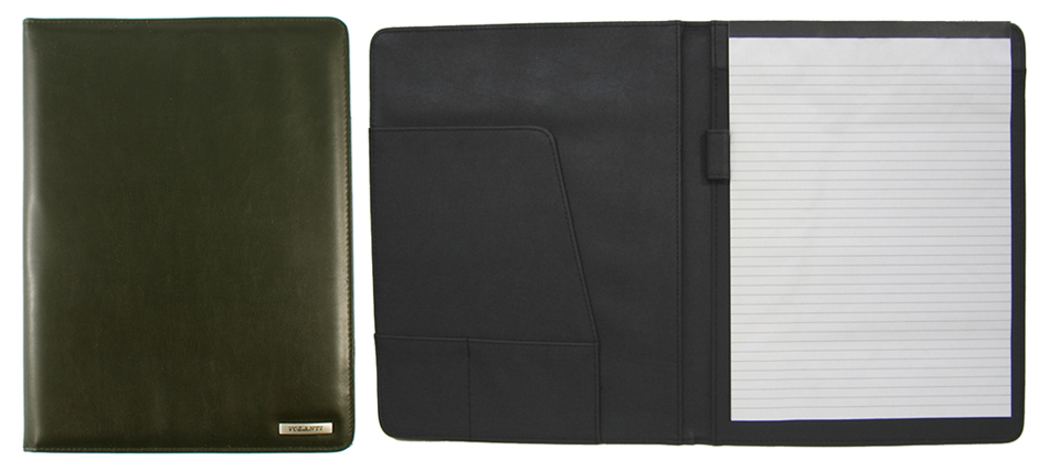 - Iso kaareva tasku, kaksi pienenpää taskua, kynäpidike, avolehtiö, etukannessa metallinen Volanti-logo