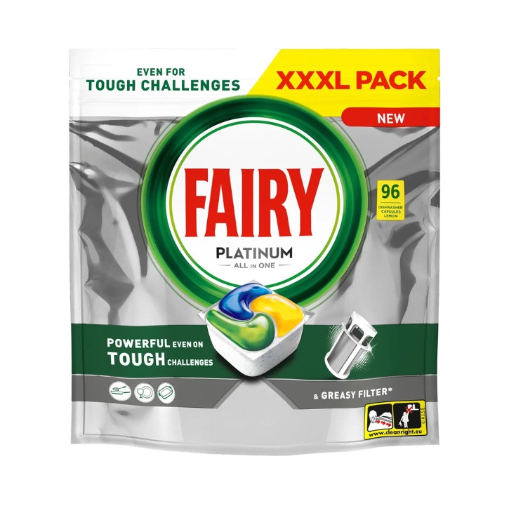 Fairy Platinum -konetiskitabletti puhdistaa jo ensimmäisellä pesukerralla tehden astioista hohtavan puhtaita. Se läpäisee haastavimmankin lian ja raikastaa rasvaisen astianpesukoneen suodattimen. Tehokas astianpesutabletti sisältää sekä neste- että jauhepesuainetta. Helppokäyttöisessä tabletissa ei ole avattavaa käärettä, aseta vain tabletti astianpesukoneen annostelulokeroon.