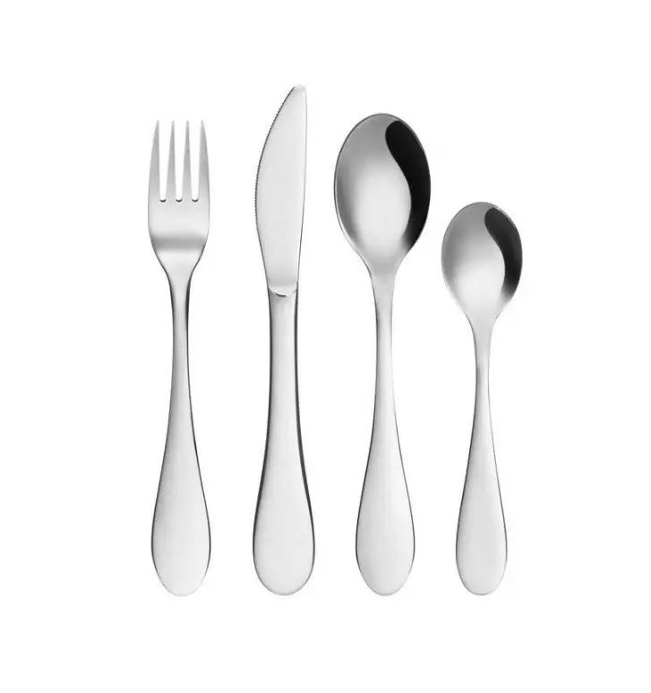 Lasten ruokailuvälineet ruostumatonta terästä. Ruokailuvälinesetissä neljä osaa: lusikka, haarukka, veitsi ja pikkulusikka.