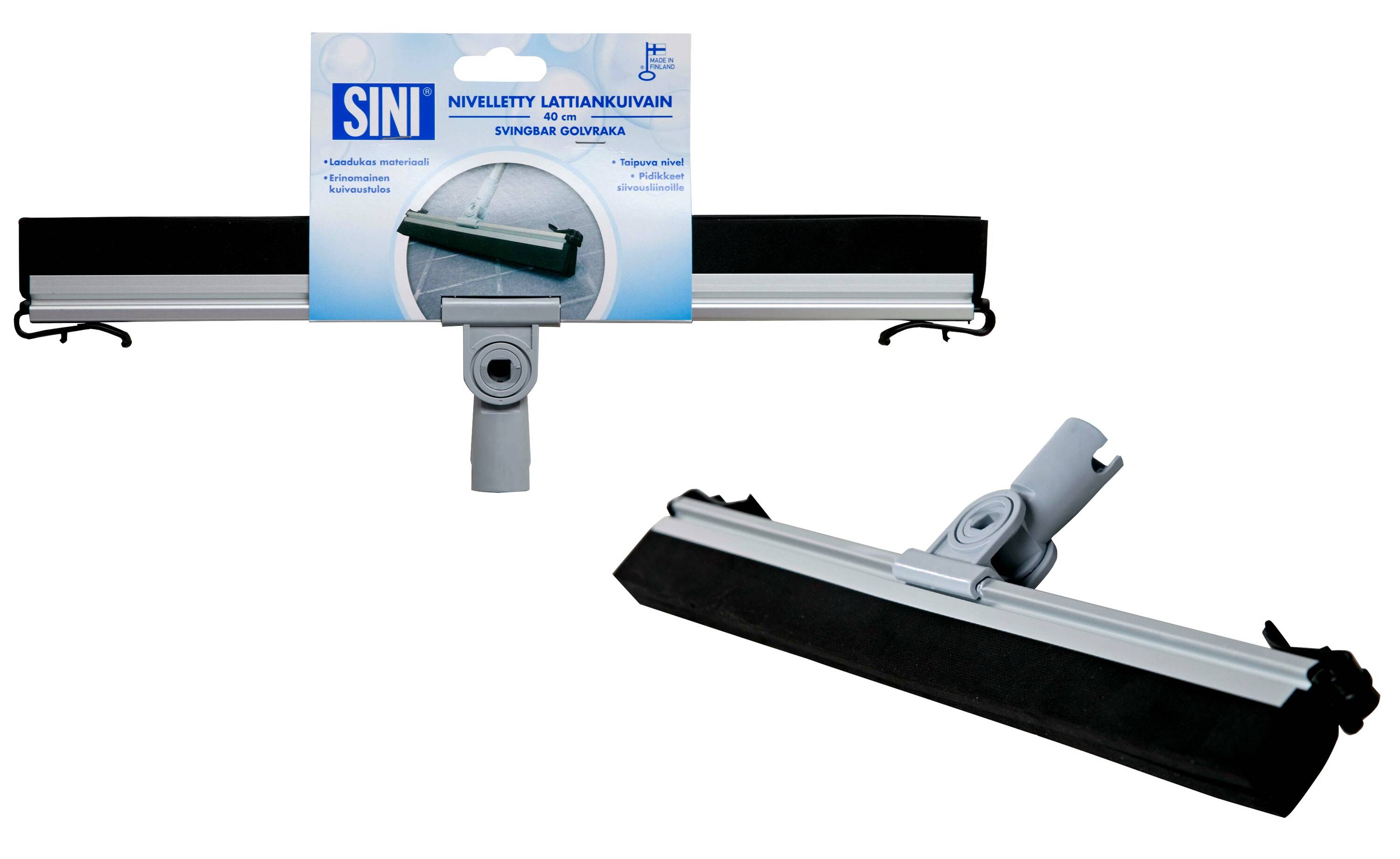 Huuhtele huolellisesti käytön jälkeen ja kuivata ilmavasti. Jotta kuivain pysyisi hygieenisenä, se kannattaa säilyttää ripustettuna, eikä lattiaa vasten. Nivelletty lattiankuivain tulee huuhdella ennen käyttöönottoa ja aina käytön jälkeen. Jotkut lattiamateriaalit saattavat muuttaa väriään reagoidessaan kumin kanssa.
