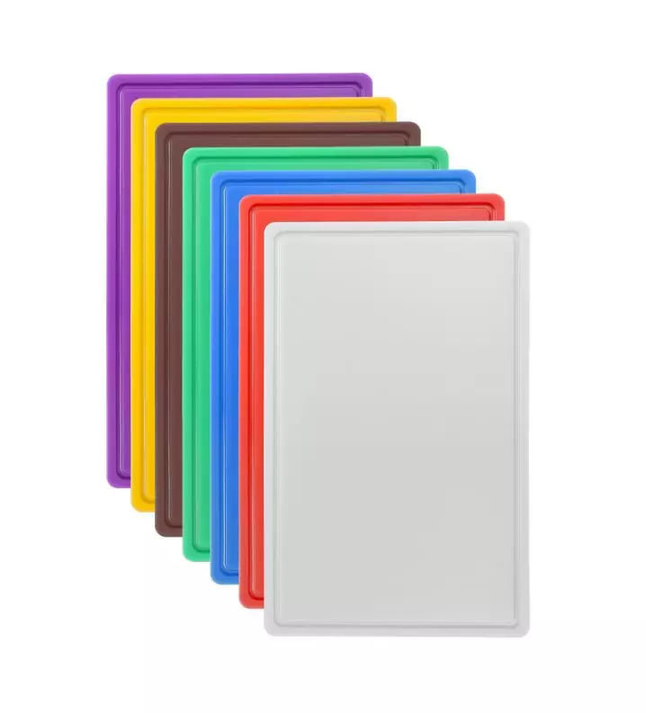 Kestävä ja paksu leikkuulauta, jonka materiaali ehkäisee veitsen tylsymistä. Toisen puolen reunaura ehkäisee nesteiden valumista. Leikkulauta GN 1/1 -kokoinen, eli 530 x 325 mm.