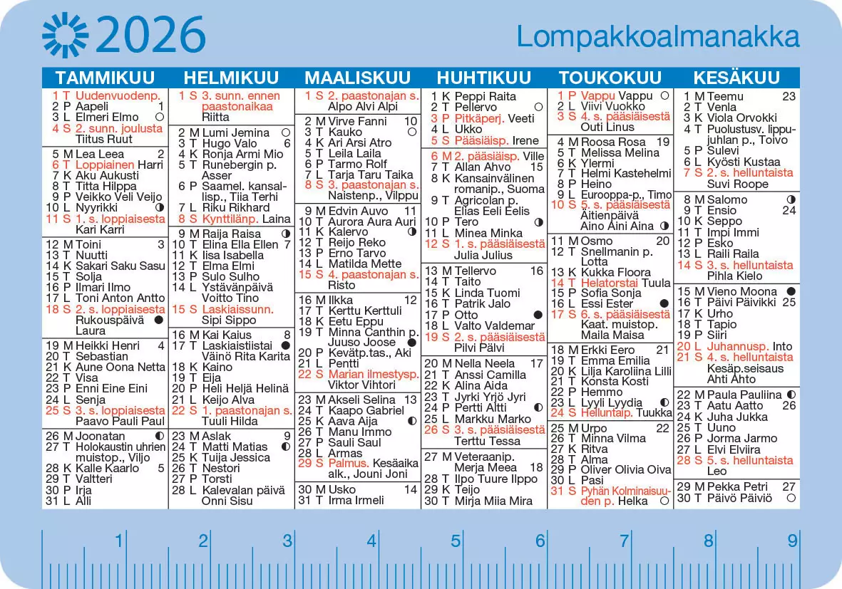 Koko 100 x 70 mm; muovinen; puolen vuoden jakso molemmilla puolilla; kirkkopyhät, juhlapäivät ja runsaasti nimipäiviä; viivain; painettu Suomessa.