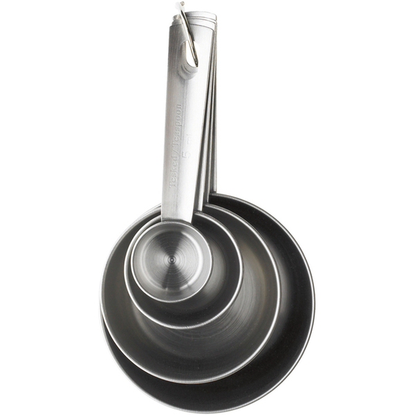 Ruostumattomasta teräksestä valmistettu mittalusikkasetti. Setissä neljä osaa; 5 ml, 15 ml, 1/2 dl ja 1 dl Hakusanat: mittalusikka, mittalusikkasarja