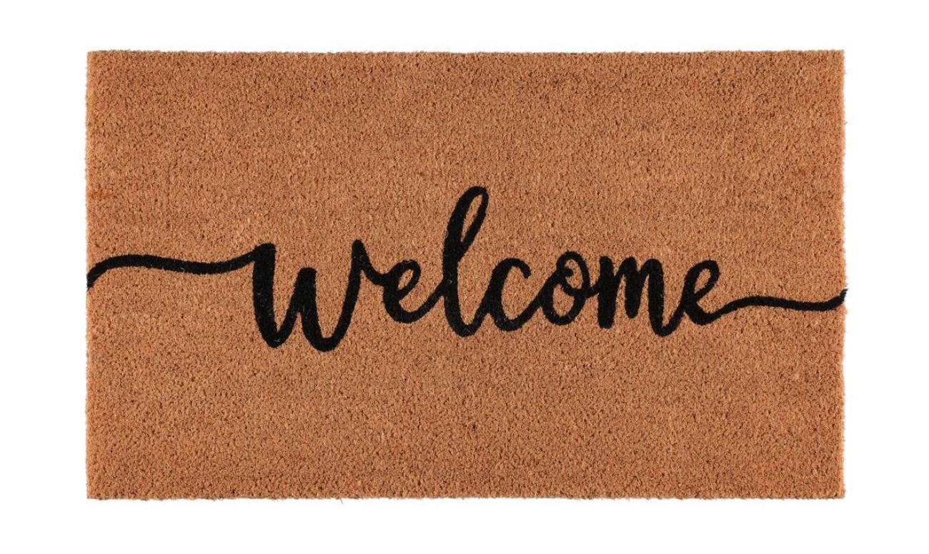 Kookoskuituinen ovimatto Welcome-tekstillä. Ovimatto kerää tehokkaasti kenkien pohjissa kulkeutuvan lian ja pölyn.