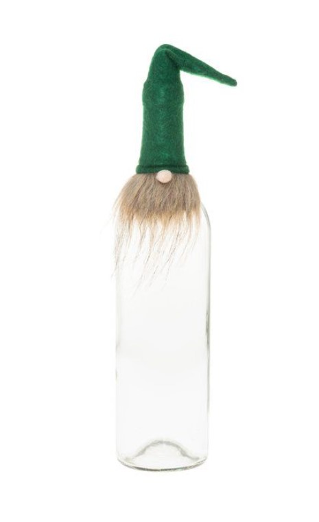 Suloinen tonttulakki ja parta, jolla voit koristella lahjapullon tai juhlapöydän juomat.