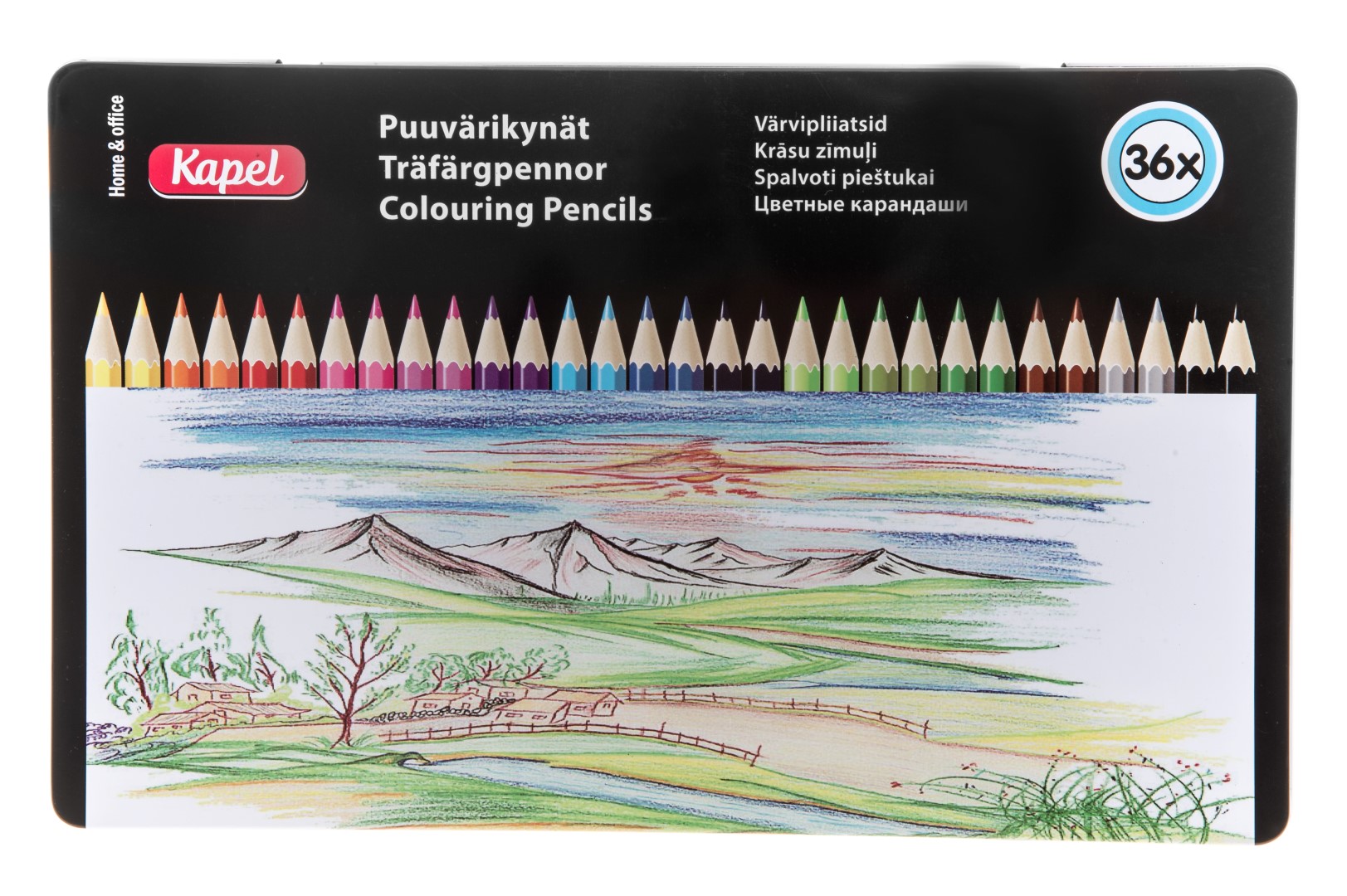 Eloisat puuvärit peltirasiassa. 36 eri väriä.