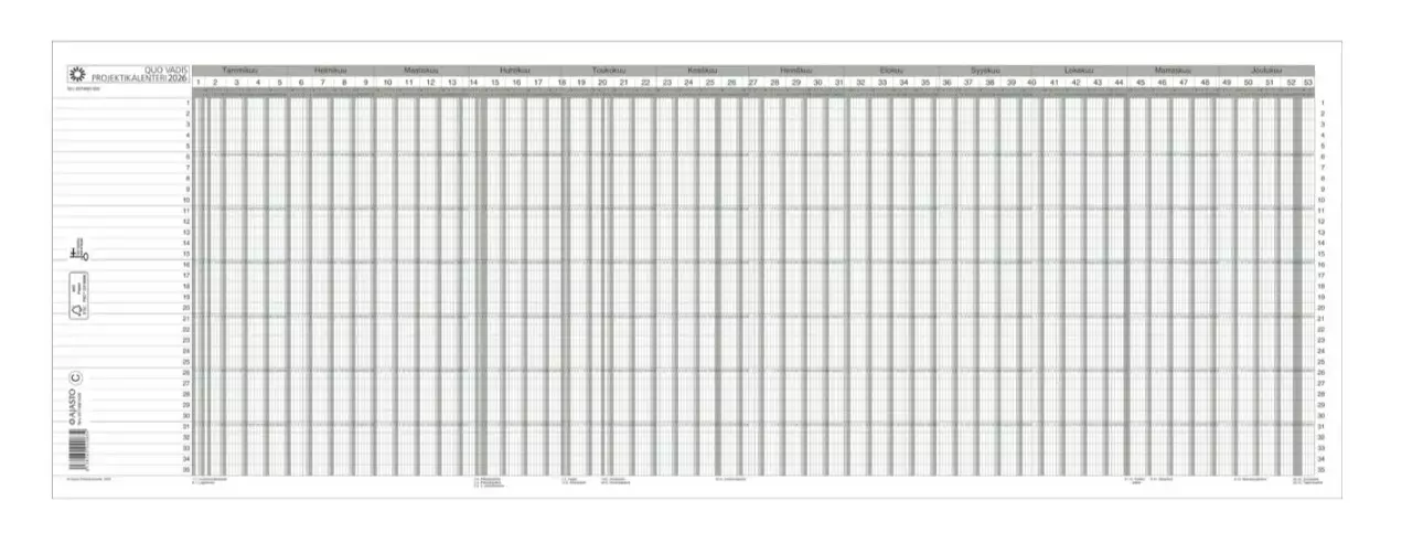 Koko 837 x 297 mm, taitettuna A4; suunnittelukalenteri, jossa koko vuosi kerralla nähtävissä; kuukaudet rinnakkain, myös viikko- ja päiväjaotus; tehtäville ja toimenpiteille rivit allekkain; Avainlippu-tuote; FSC®-sertifioitu tuote.