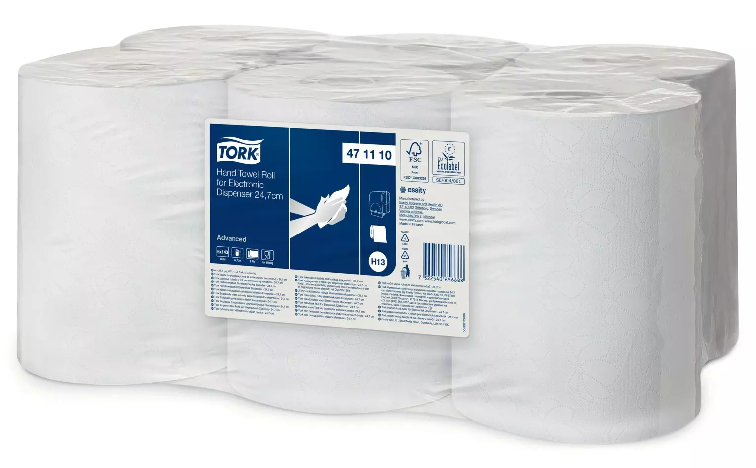 Elektroninen annostelija Tork rullakäsipyyhkeille annostelee yhden paperipyyhkeen kerrallaan, mikä vähentää kulutusta ja parantaa hygieniaa. Advanced-rullan suuri kapasiteetti takaa paperin riittävyyden, ja rulla sopii ihanteellisesti saniteettitiloihin, joissa on paljon kävijöitä, kuten kouluihin ja lentokentille.