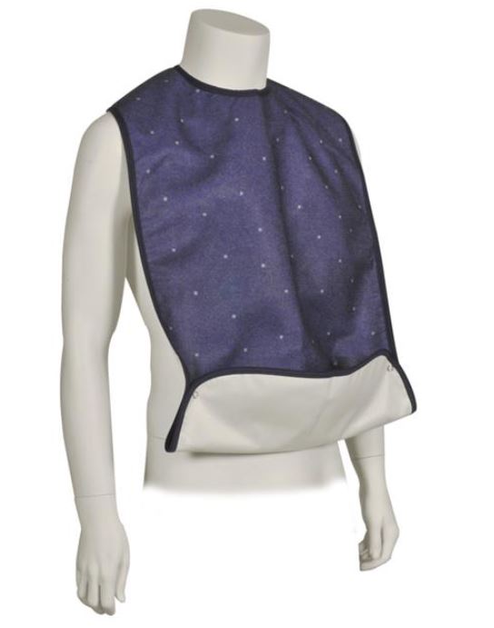 Pestävä aikuisten ruokalappu. Imukykyinen pinta ja nesteenpitävä taustakerros pitävät alla olevat vaatteet puhtaina ja kuivina.