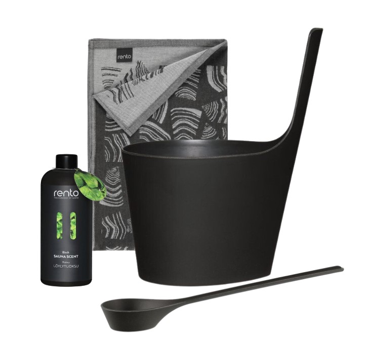 Tyylikäs tumma saunasetti, jossa Rento Pisara -sarjan saunakiulu ja -kauha, Rento Pino laudeliina sekä Rento koivun tuoksuinen löylytuoksu.