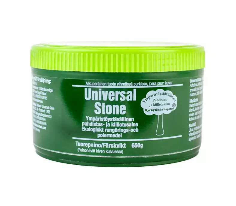 Universal Stonen teho perustuu sen sisältämään vihreään saippuaan, kiillotussaveen sekä glyseriiniin. Vettä käytettäessä kiilotussavi ja saippua sekoittuvat keskenään ja muodostavat vaahtoa, joka irroittaa tehokkaasti vaikeatkin likatahrat. Kiillotussaven hienojakoisuuden ansiosta tuote ei naarmuta. Universal Stonen sisältämä kasvipohjainen glyseriini sulkee pinnan puhdistuksen jälkeen, jolloin uusi lika ei tartu pintaan yhtä helposti.