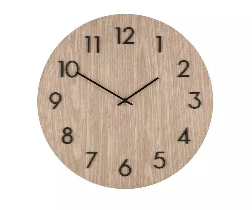 Isokokoinen seinäkello on valmistettu vaalean puun värisestä MDF-levystä. Kellossa on mustat 3D-numerot ja mustat alumiiniviisarit.