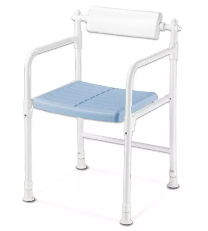 Kätevä pieneen tilaan taittuva suihkutuoli.