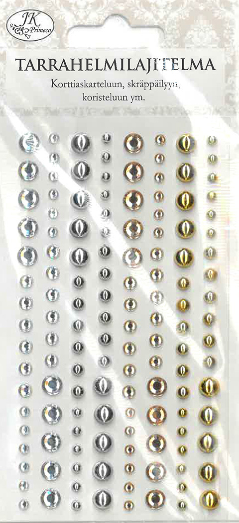 Lajitelma erivärisiä ja erikokoisia tarrahelmiä.