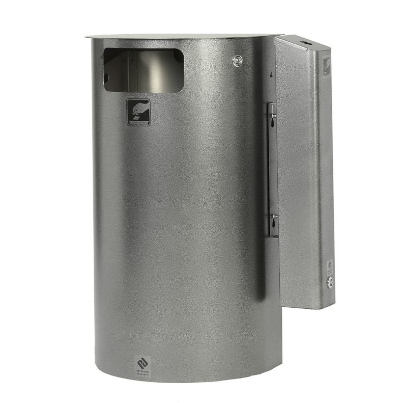 Seinäänkiinnitettävä puolikuun muotoinen roska- ja tuhka-astia yhdistelmä.