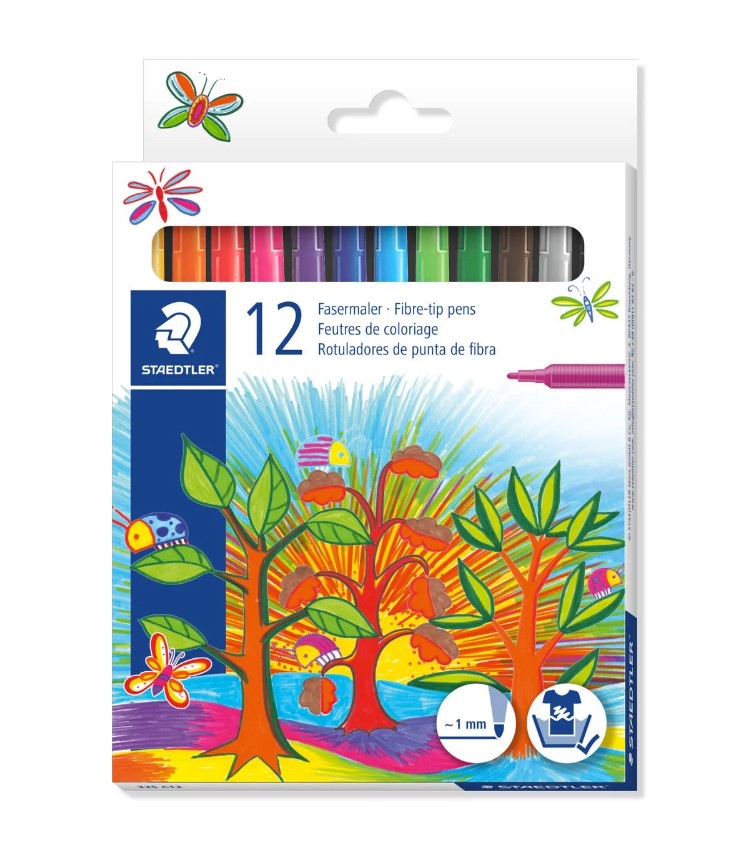 Kuitukärkinen tussi piirtämiseen ja värittämiseen. Pakkauksessa 12 värin lajitelma.