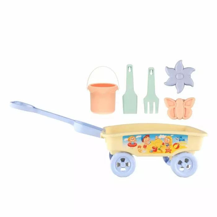 - Suloinen hiekka/pihaleikkisetti, jossa on pieni vetokärry, jossa mukana pieni lapio ja harava, muotteja sekä ämpäri.