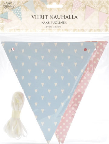 Pakkaus sisältää 3,5m nauhaa ja 12 kaksipuolista viirilippua, joiden toinen puoli on vaaleanpunainen ja toinen puoli vaaleansininen. Viireissä kuutta erilaista kuviota, mm. pisteitä, sydämiä, pilviä ja raitaa.