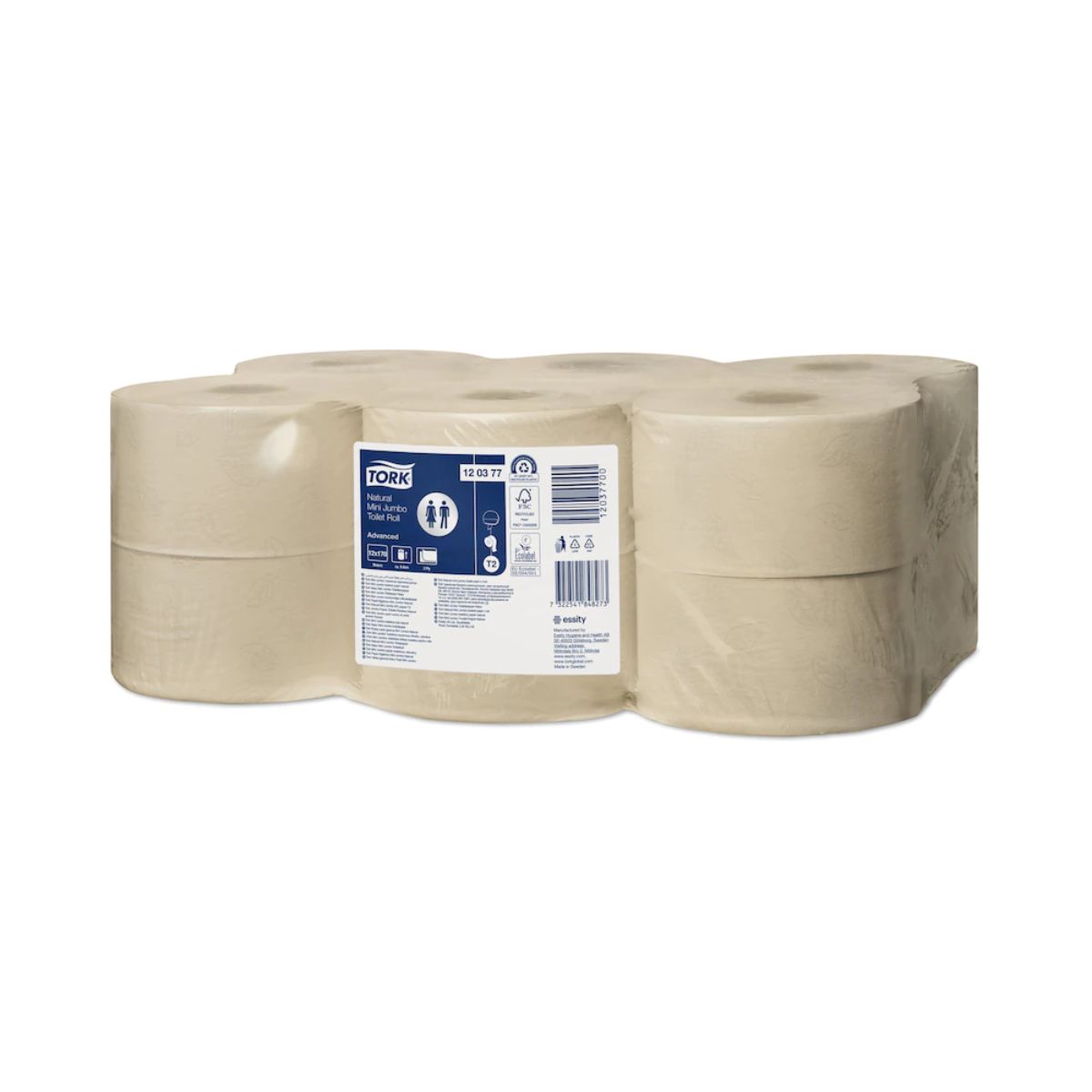 Tork Mini Jumbo -järjestelmässä on paljon enemmän WC-paperia kuin perinteisissä rullissa. Näin se tehostaa ajankäyttöä ja vähentää kustannuksia. 2-kerroksinen Tork Mini Jumbo WC-paperi tasapainottaa kustannukset ja tehokkuuden. Se sopii saniteettitiloihin, joissa on kohtalaisesti tai paljon kävijöitä. Paperi valmistetaan 100-prosenttisesta kierrätyskuidusta.